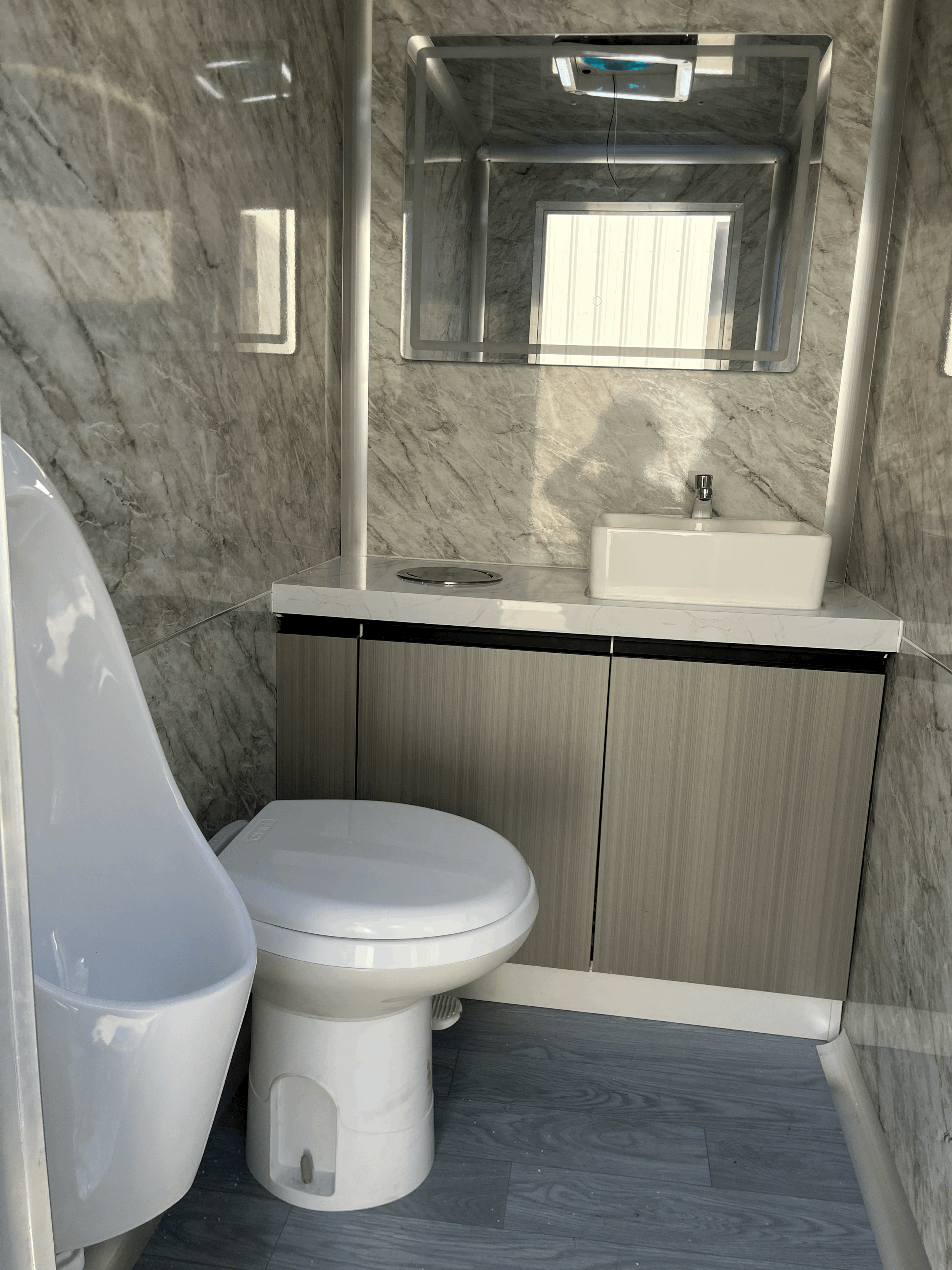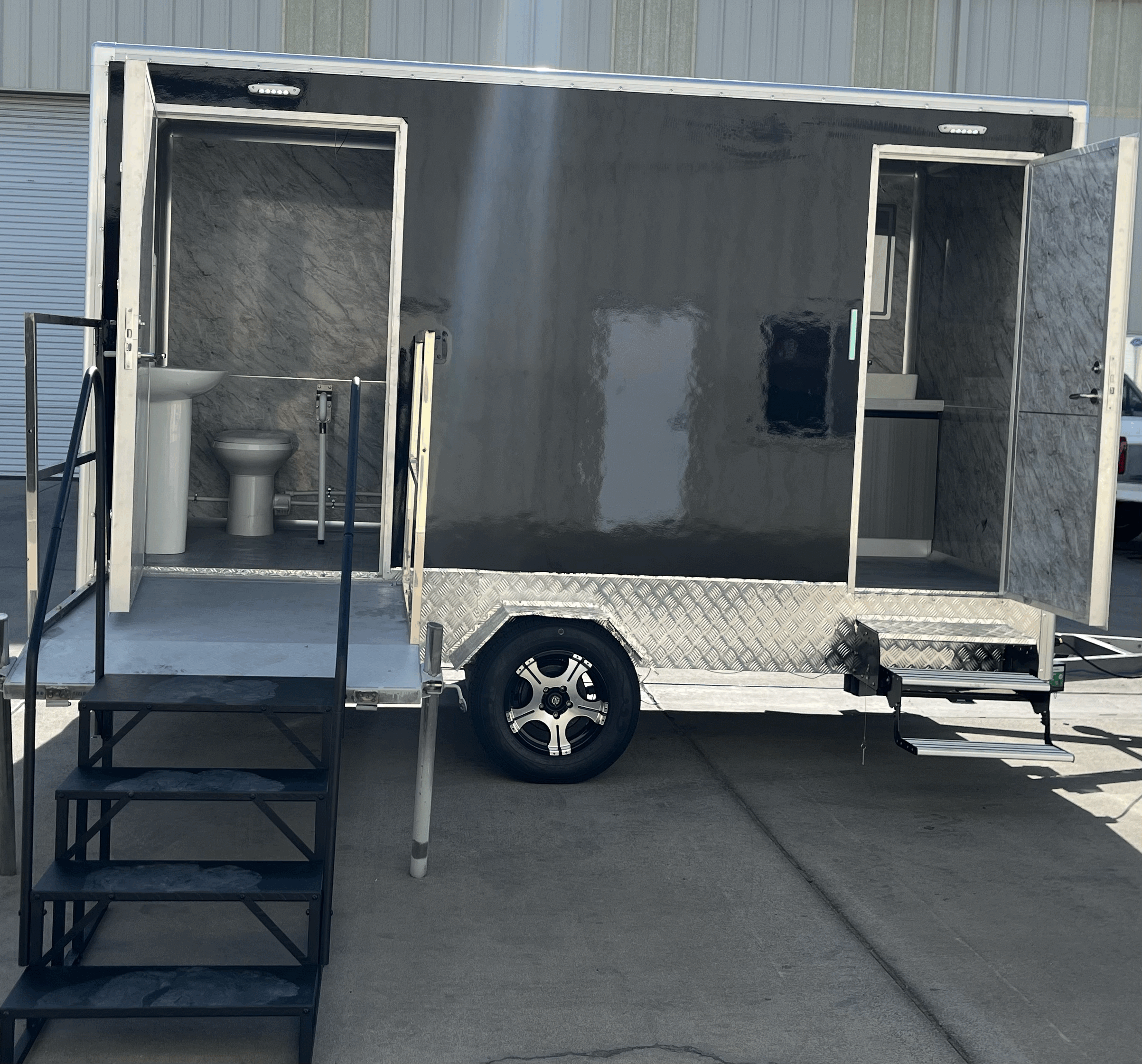 Our 2 Station Luxury Trailer offers water flowing sinks, hands-free flushing toilets, AC/Heat, and toiletries.